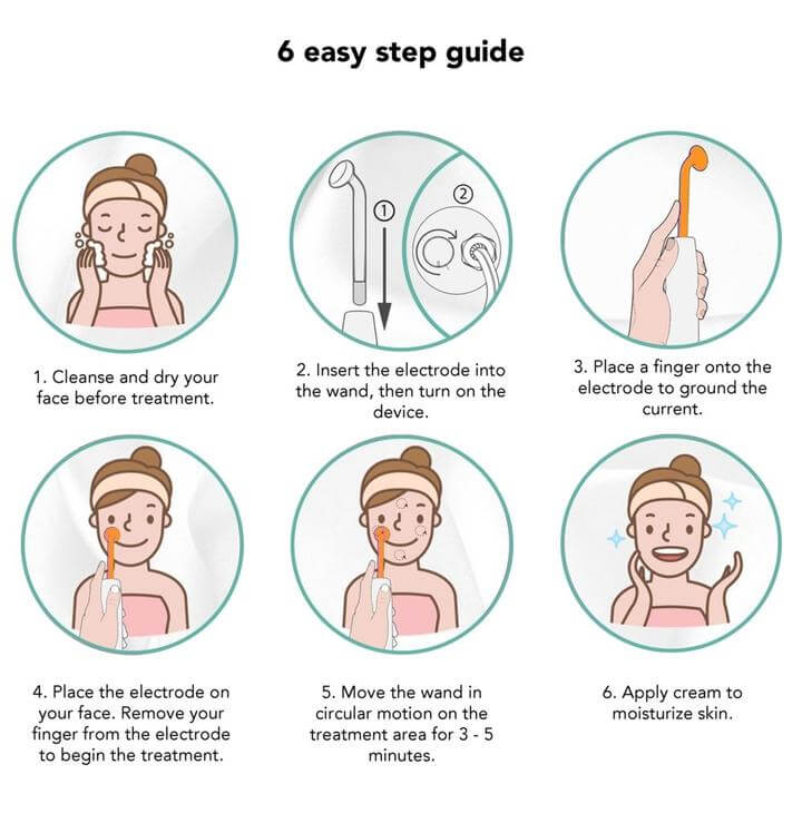 Clean and dry your face, insert the electrode into the wand, plug it in, and turn the device on. Move the wand in slow circular motions over your skin for 3–5 minutes. When finished, turn the power off, clean the attachment with warm water and soap, and apply your moisturizer.